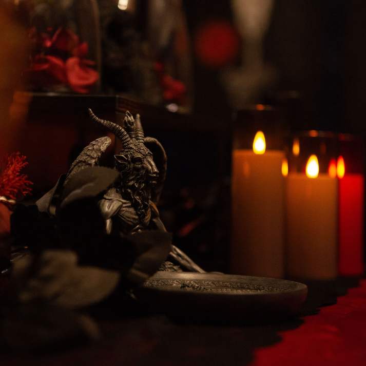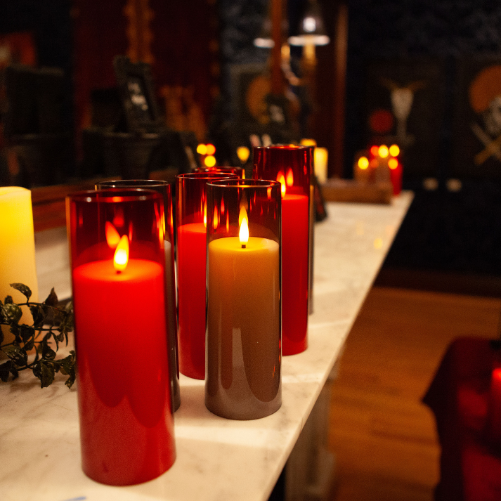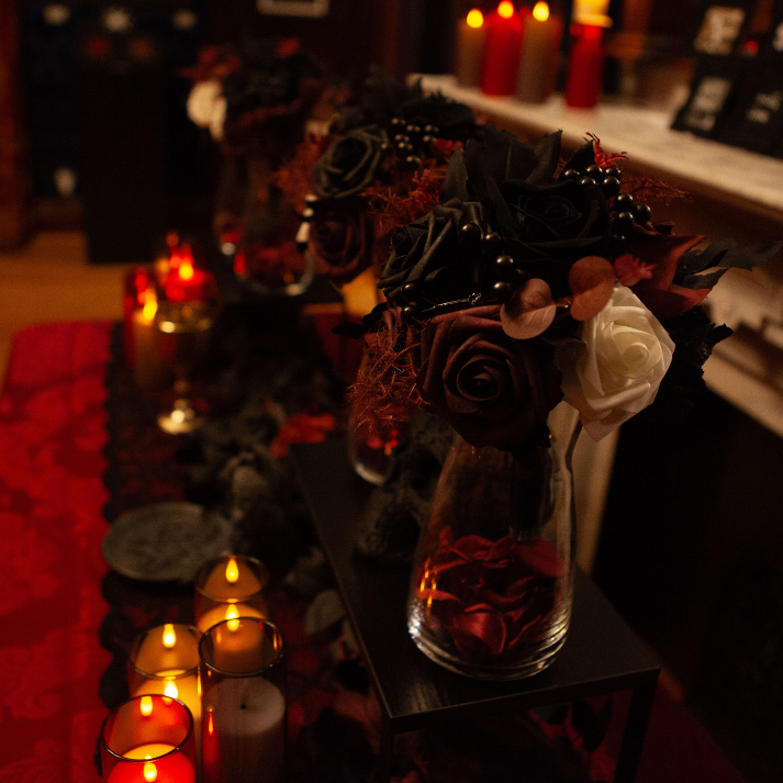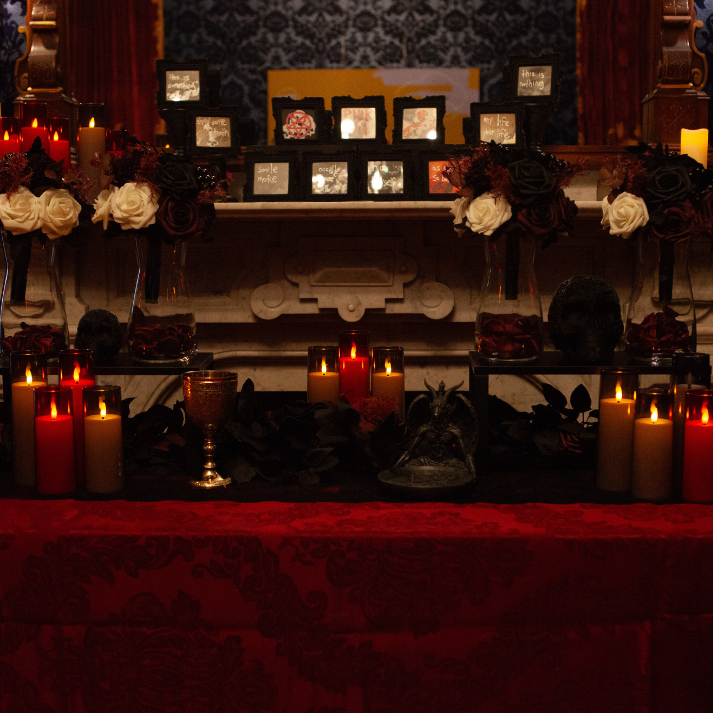 - Flickering LED candles in black and burgundy on the altar, mantle, along the floor and in Milton Hall to enhance the vibe
