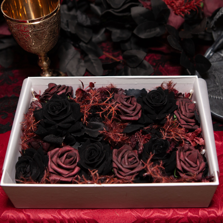 - A ceremony altar table draped in black and burgundy cloths and lace. The table will also be decorated with black and burgundy florals, artifacts, ceremonial tools and additional decor.